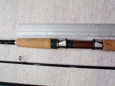 Blank budowany na zmówienie pracowni z grafitu GI+ (czyli około 40 mln PSI). Korek klasy floor. Uchwyt downgrip Alpsa z wstawką z drewna różanego. Przelotki Pacific Bay SiC. Wykończenie stonowane, bez ozdobników - czarne.