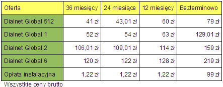 Cenowo DialNet Global jest porównywalny z szerokopasmowym dostępem do internetu oferowanym przez innych operatorów, a wysokość abonamentu zależy od okresu, na jaki klient podpisze umowę z operatorem: